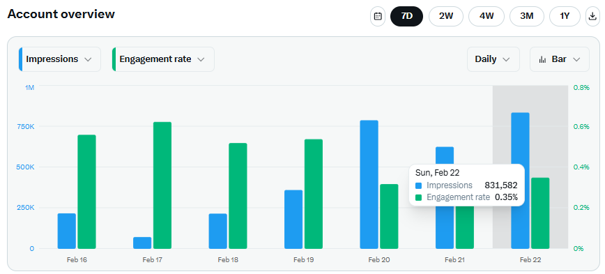 1달만에 수익화 노출이 가능한 이유는 요즘 조회수(노출)가 하루 100만 가까이 터지고 있습니다. 2월 20일날 조회수 78만을 기록한 후 부터 21일에 60만대로 주춤했지만 22일 역대 최고 조회수를 기록하며 현재 83만을 기록 중입니다.