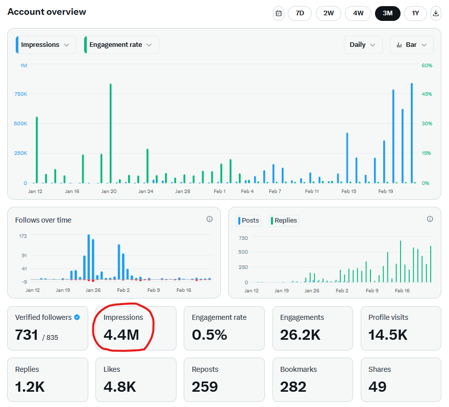 저는 하루 20만 노출을 목표로 댓글 파밍 작업을 진행해오고 있는데요. 첫 결제일이었던 2026년 1월 21일부터 글을 작성하고 있는 2026년 2월 22일까지 약 4.4백만의 조회수를 기록하고 있습니다. 목표였던 1달 만에 수익화 조건 달성까지는 쉽지 않을 것 같지만, 지금 페이스라면 충분히 가능해보이기도 합니다. (다음 결제일은 2월 26일입니다)